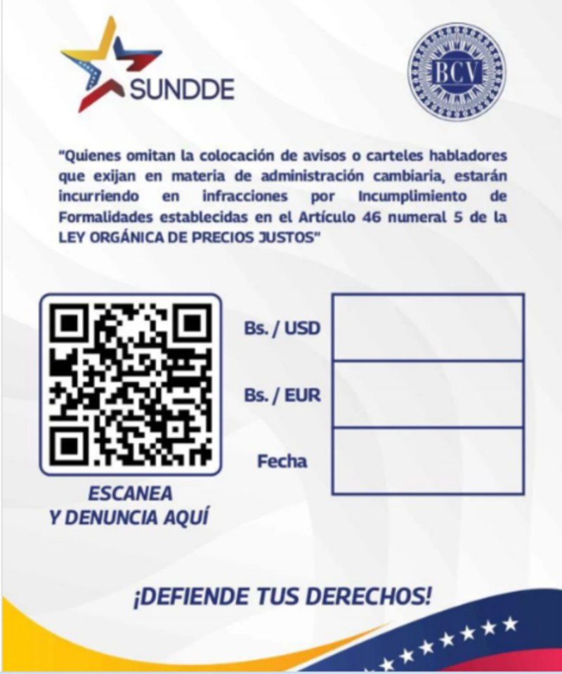 La Superintendencia Nacional para los Derechos Socioeconómicos (SUNDDE) aprobó un nuevo formato de publicación de la tasa oficial del Banco Central de Venezuela (BCV), que deberán tener expuestos los comercios.