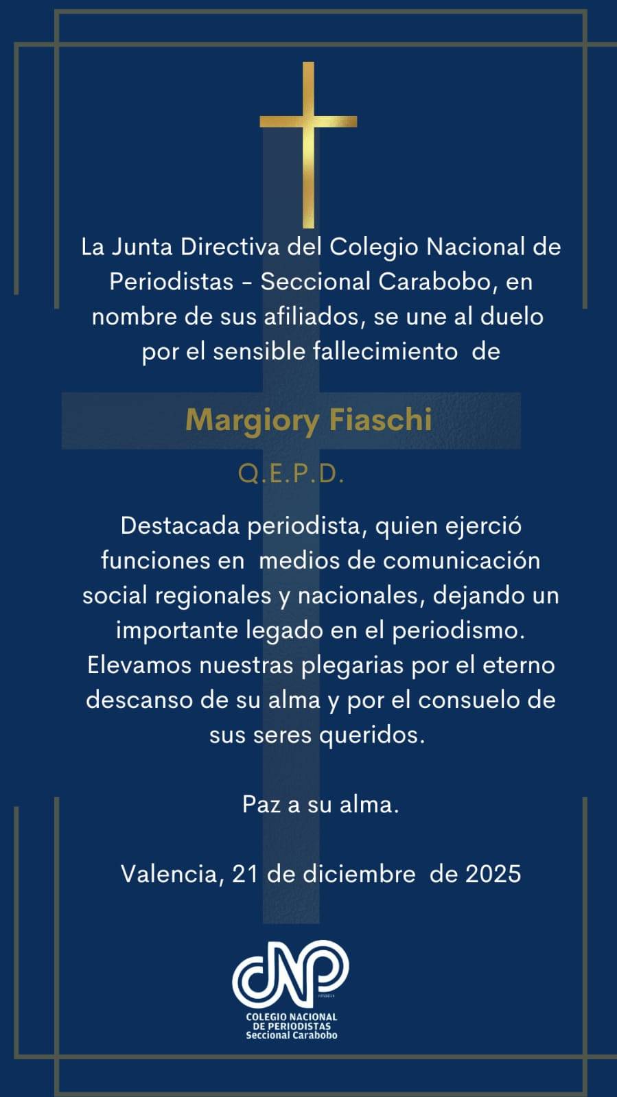 Además, el Colegio Nacional de Periodismo seccional Carabobo envió una carta de condolencias.