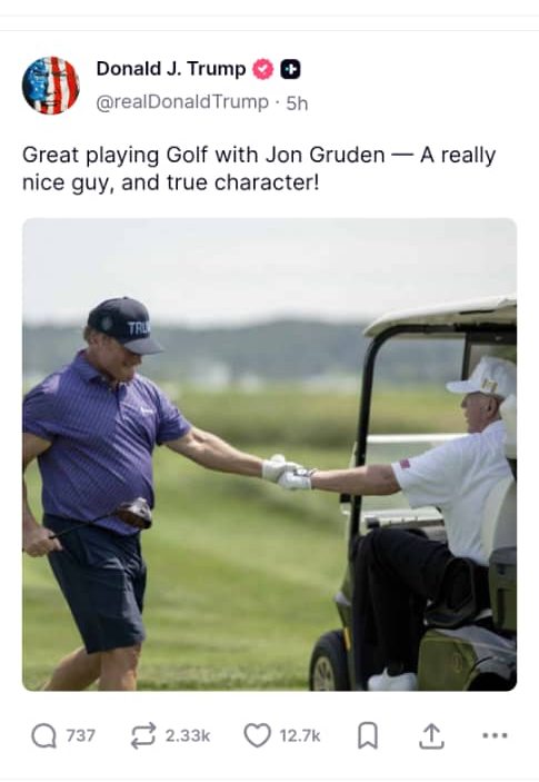 Trump publicó en las redes sociales por primera vez desde que surgieron los rumores:»¡Genial jugar al golf con Jon Gruden! ¡Un tipo muy majo y con mucha personalidad!», comentó en la publicación.