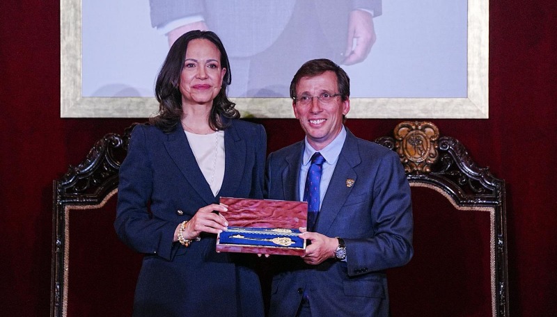 La líder de la oposición venezolana, María Corina Machado recibió la Llave de Oro de Madrid, España, de la mano del alcalde de la capital, José Luis Martínez.