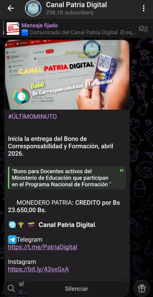 La Plataforma Patria inició la entrega del bono «Corresponsabilidad y Formación» correspondiente al mes de abril 2026.