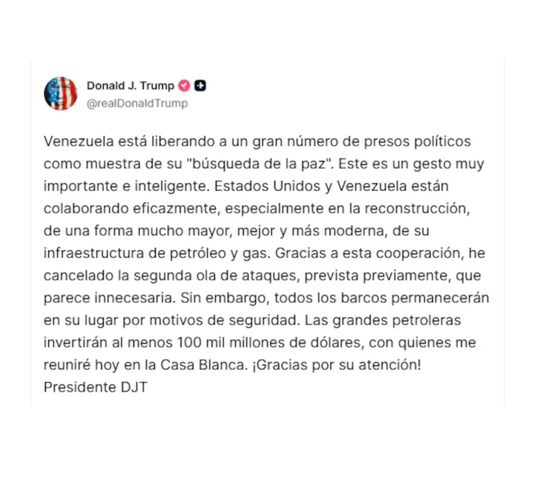A través de un mensaje difundido en Truth Social, Trump destacó que la cooperación entre Washington y Caracas es actualmente “excelente”. Especialmente en materia energética.